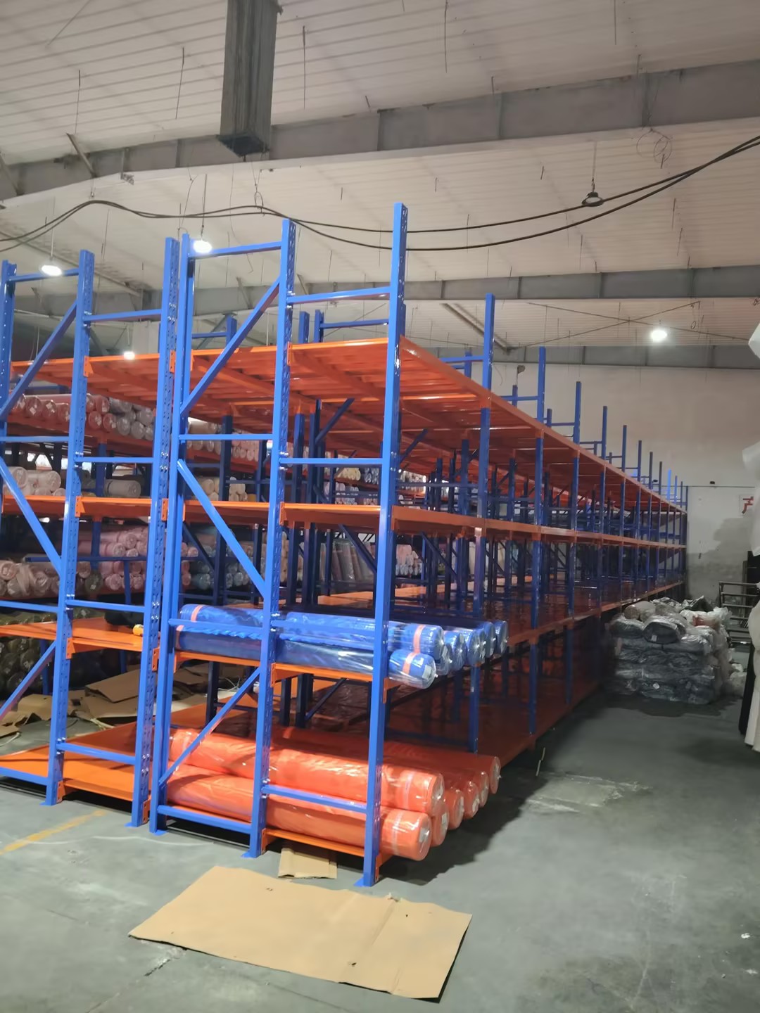 嘉兴某纺织科技公司采购一批布匹货架,布匹货架:属于重型货架,将托盘放置在货架上,借助叉车等机械搬运设施存取货物,每层承重可达 4 吨,适合存放大卷的布匹,结构简单,性价比高。
